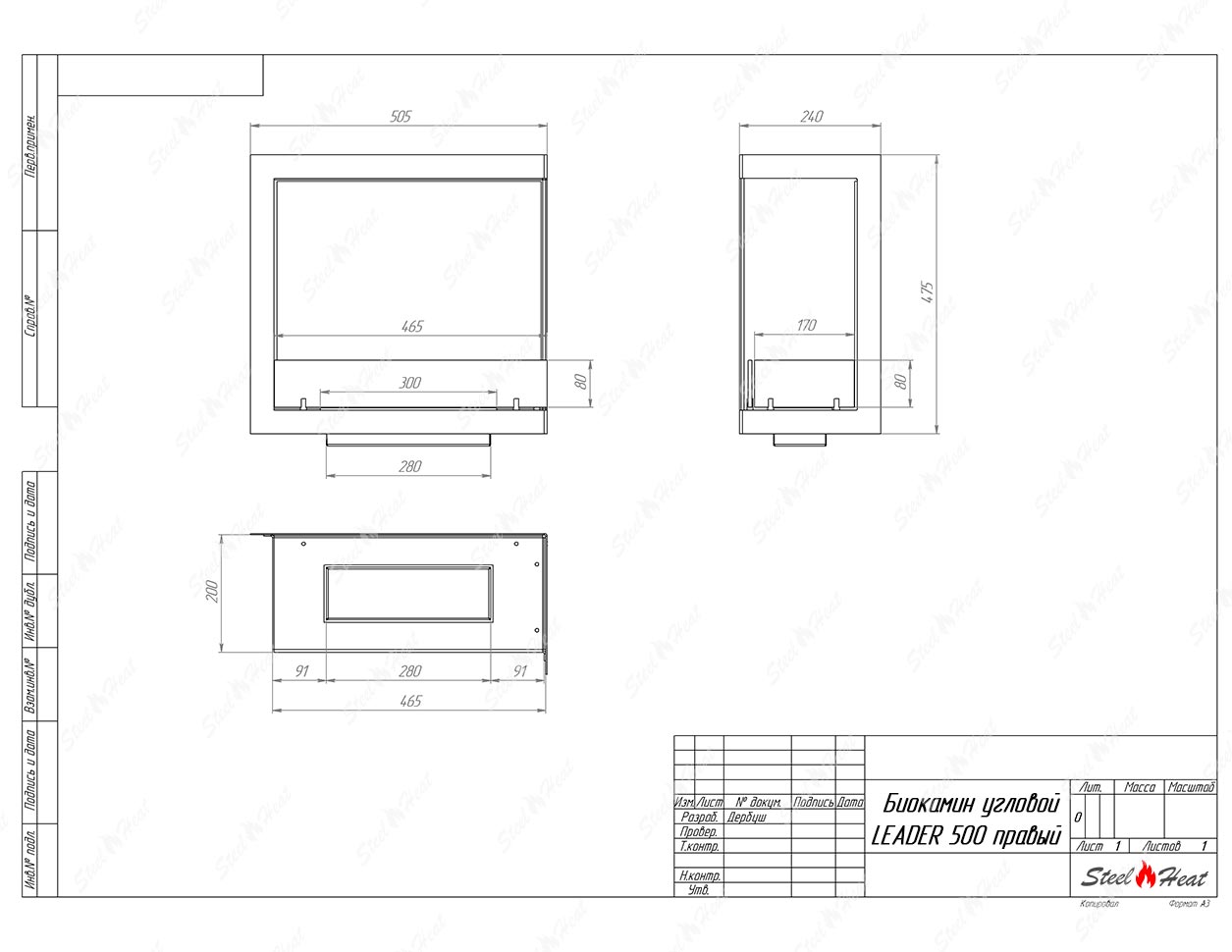 Встраиваемый Биокамин угловой SteelHeat Leader 500 правый предназначен для встраивания в глухие ниши из гипсокартона, кирпича, пеноблоков, бетона.